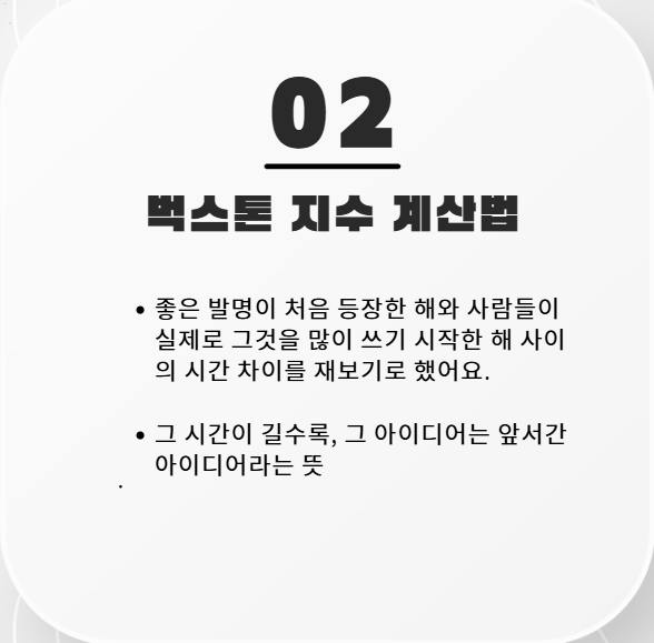 사람들이 그것을 쓰기 시작했을 때 사이의 시간 차이를 말해요. - 이 지수가 높을수록, 그 아이디어는 세상을 앞서간 생각이라는 뜻이에요.