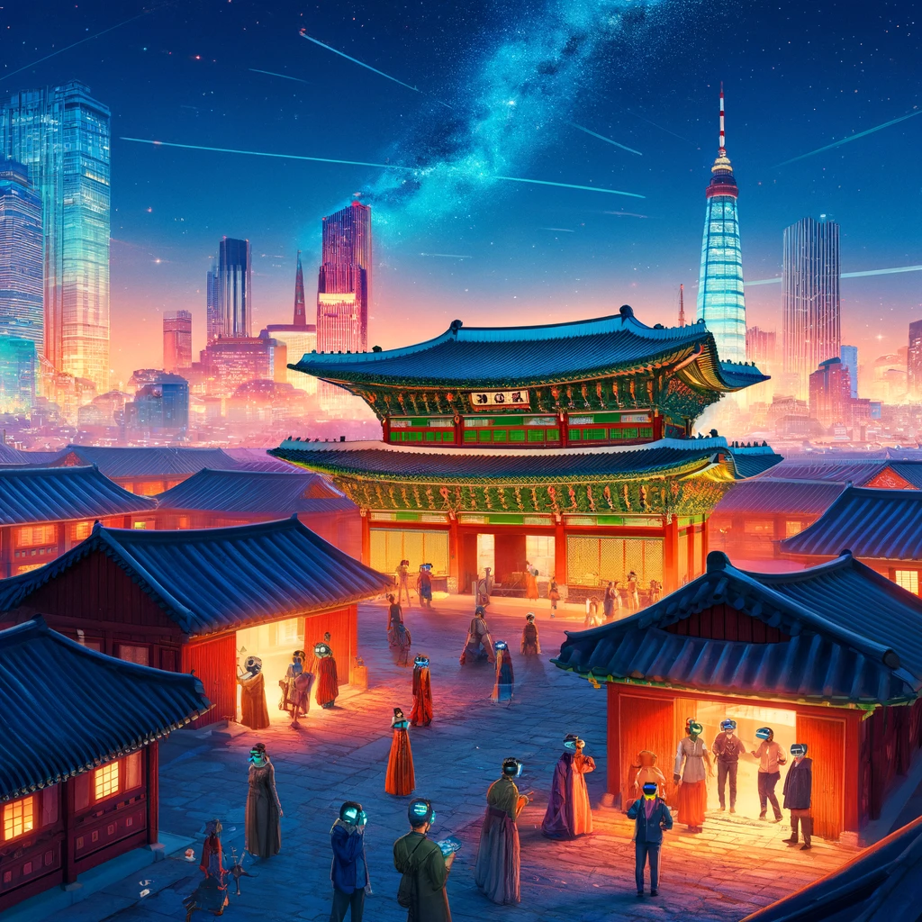 "경복궁의 웅장한 전경과 현대적인 서울 스카이라인이 어우러진 모습을 경험하세요. 밤하늘 아래 화려하게 조명된 경회루의 반영된 빛, AR 안경을 통한 역사적 장면의 체험, VR 체험부스에서의 조선 시대 경복궁 탐방까지, 전통과 현대 기술이 조화를 이루는 경복궁의 과거, 현재, 미래를 상상해 보실까요?"